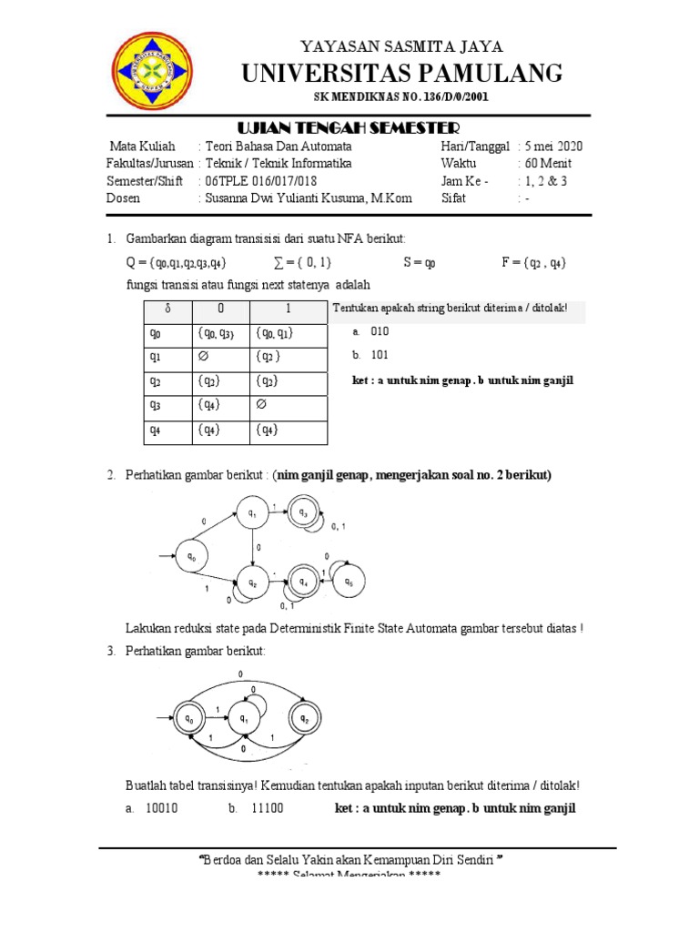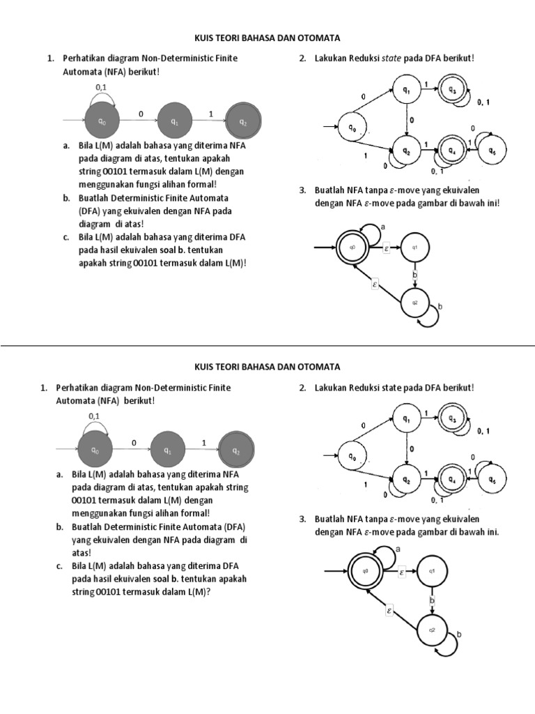 Contoh Soal Teori Bahasa Dan Otomata from imgv2-1-f.scribdassets.com Contoh soal teori bahasa automata. Soal dan jawaban tentang teori bahasa automata erwin. Buatlah minimalisasi dari nfa berikut. Ada beberapa hal yang berkaitan dengan otomata, yaitu grammar. Soal dan jawaban teori bahasa otomata soal. Latihan soal dan jawaban teori bahasa dan automata 1. Karena input diberikan ke otomat, ia membuat transisi ke keadaan berikutnya, tergantung pada fungsi transisi. Delta, fungsi transisi yang menggambarkan transisi state fsa akibat pembacaan.