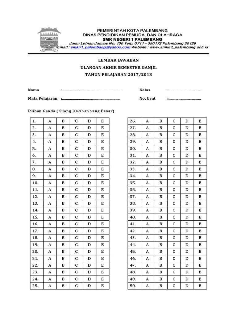 format.xlsx microsoft excel . Contoh lembar jawaban 100 soal upmn politeknik negeri ketapang. Sekolah menengah atas al anwari tanah merah bangkalan. Lembar jawaban ulangan akhir semester genap. semua tema perangkat pembelajaran kurikulum 2013 kelas 2 sd semster 1 dan 2 lengkap.